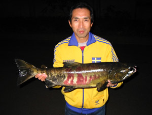 コメント : 今年も釣れたので投稿してみました。この日3匹釣れた中で一番でかい野郎です。ドラグをいっぱいに締めてたのにギューギュー引っ張られました。見た目以上の暴れん坊でした。