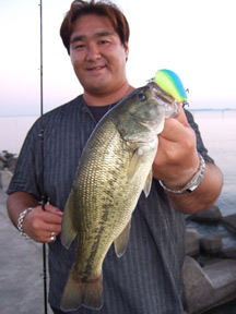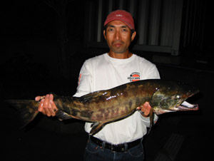 コメント :この夏に22フィートの船を譲ってもらって、今まで陸から届かなかった「あそこすごくボイルしててつれるだろうなー」って思っていたおいしいポイントに行くことが出来るようになりました。それも船で出てたったの3分のところで・・・で結果が一投目からすぐに「ゴン!!」「ぎゅーん!!」で楽しかったです。