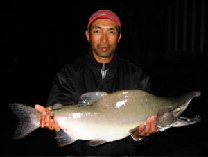 コメント :この日は夜勤帰りの同僚と待ち合わせ、朝の1時頃夜明け前から釣り始め、銀毛の雌がヒットしました。